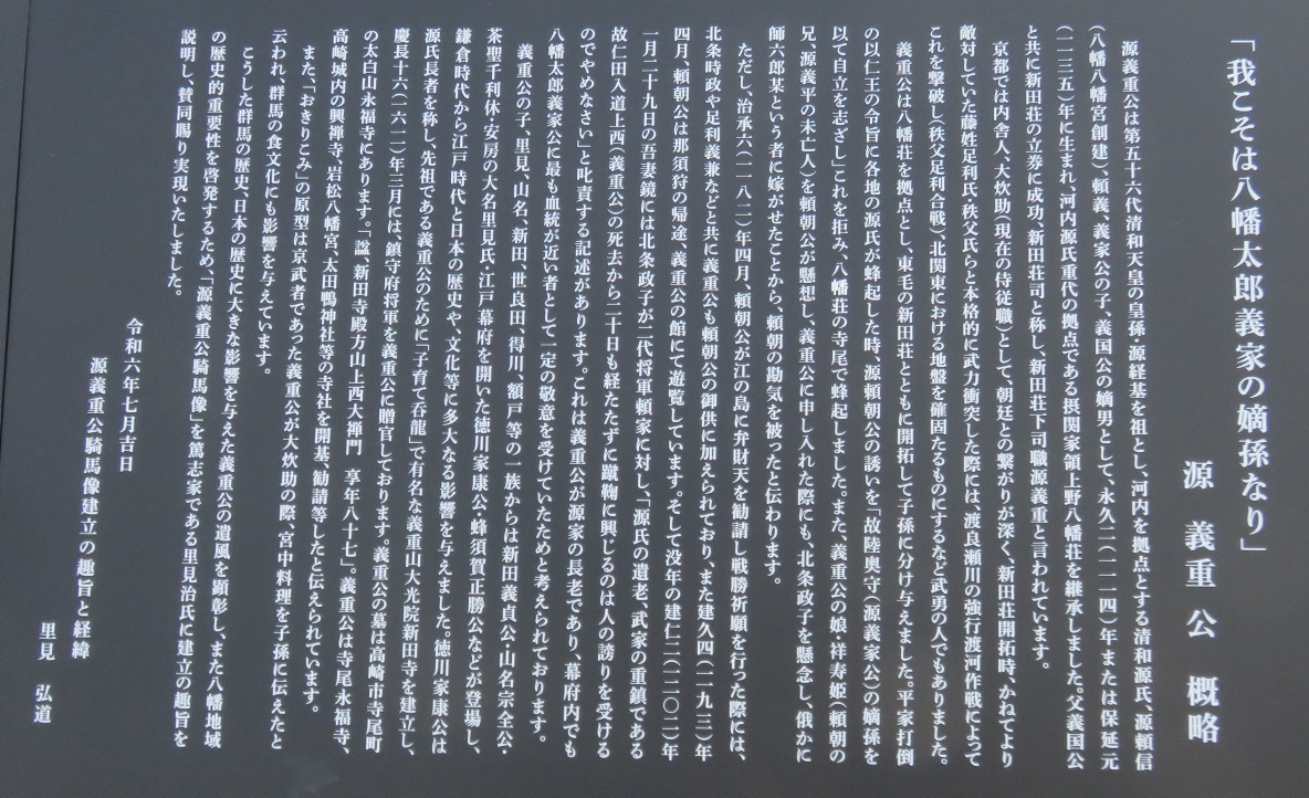 こうした群馬の歴史、日本の歴史に大きな影響を与えた義重公の遺風を顕彰し、また八幡地域の歴史的重要性を啓発するため、「源義重公騎馬像」が実現致しました。