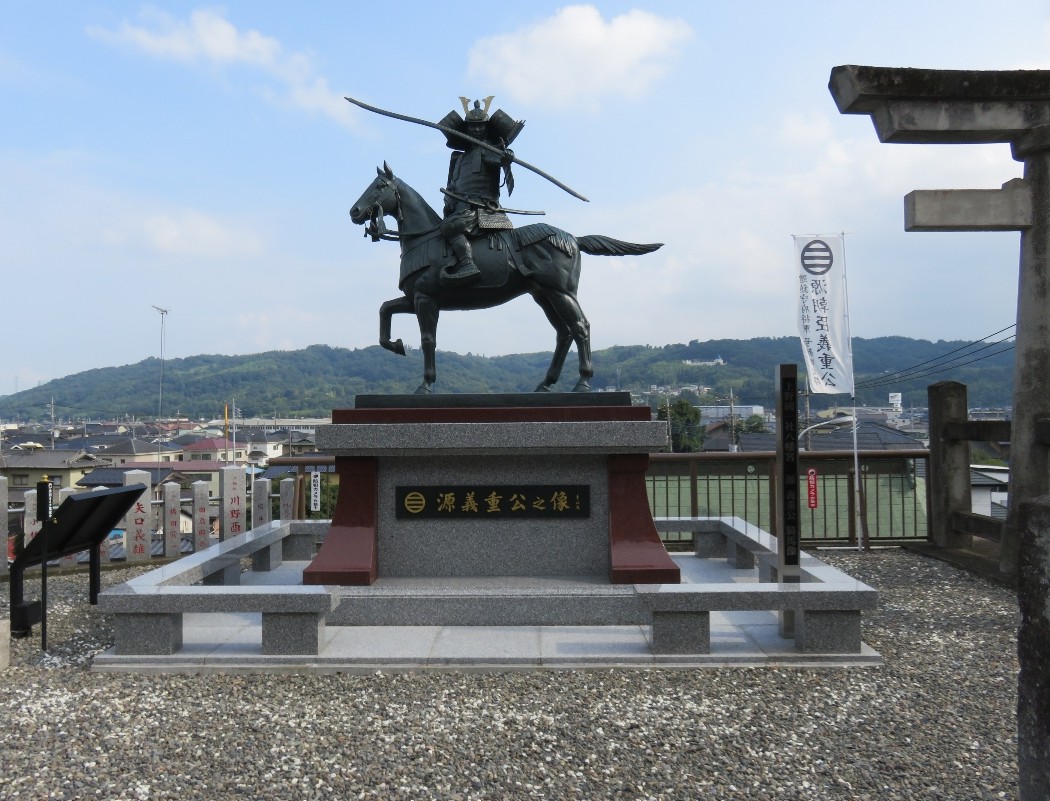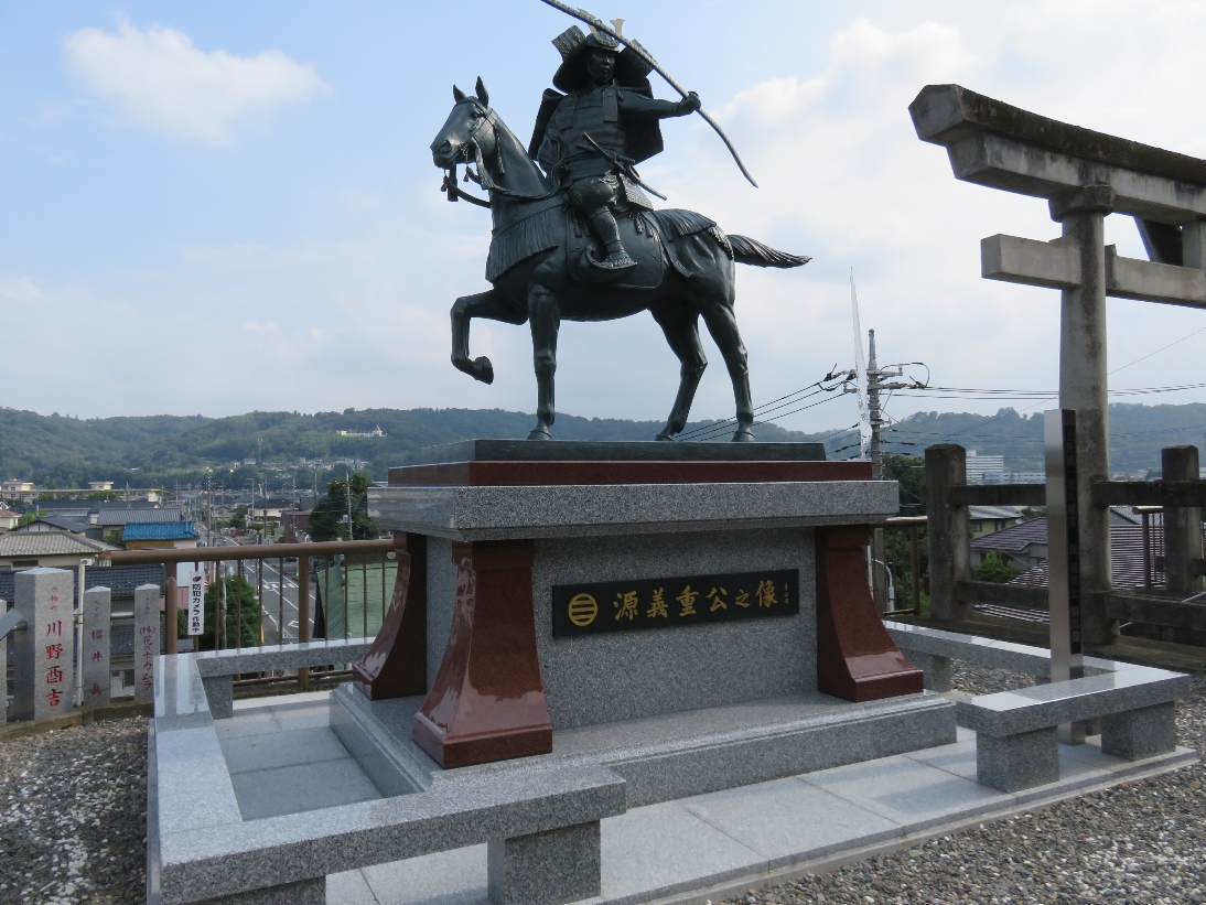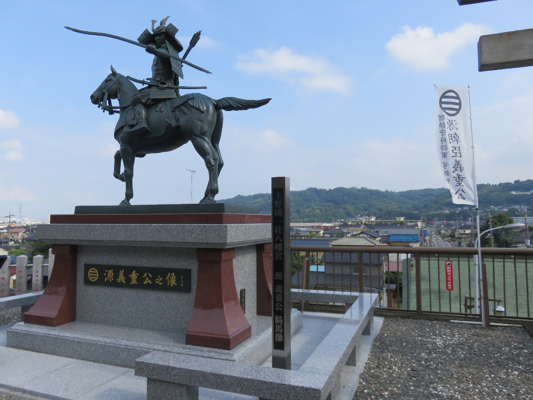 ●高崎市の八幡八幡宮の新田義重公の銅像・・・・所在地 〒370-0884 群馬県高崎市八幡町655 高崎市の上野国一社八幡八幡宮に新田義貞、徳川家康らのルーツで、平安末期の上野国(現・群馬県)を拠点に活躍した武将、源義重の遺風を顕彰する「源義重公騎馬像」が設置され完成。題字は、タレントの中山秀征氏。令和6年(2024)年8月3日に完成記念式典が開かれた。寄進者で、甘楽町出身の里見治セガサミーホールディングス会長をはじめ、関係者約120人が騎馬像の建立を祝った。