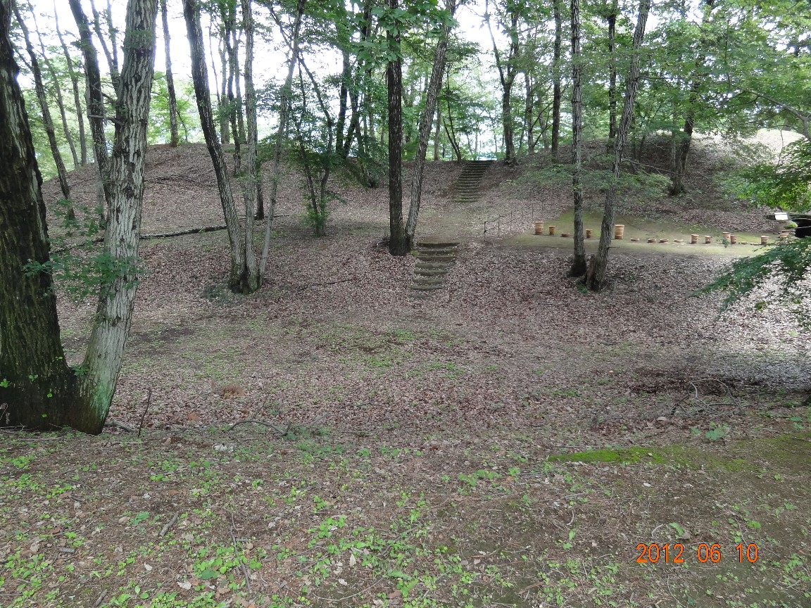 前橋市の大室古墳群の後二子古墳の周堀と2段の墳丘の階段と右側の石室の様子(2012/6/10) |
