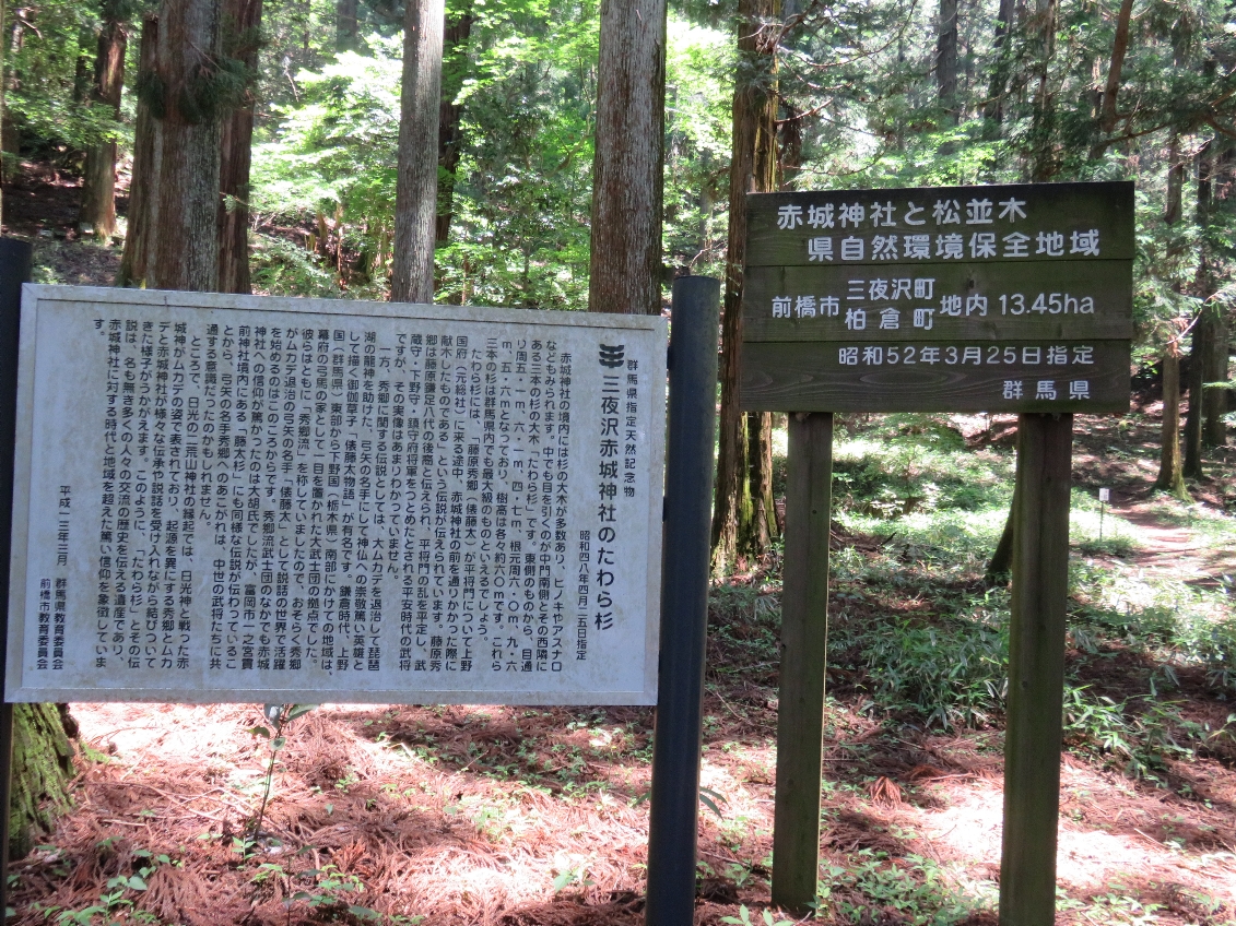 三夜沢赤城神社の参道入口にある群馬県の自然環境保全地域の説明版(2025/6/17) |