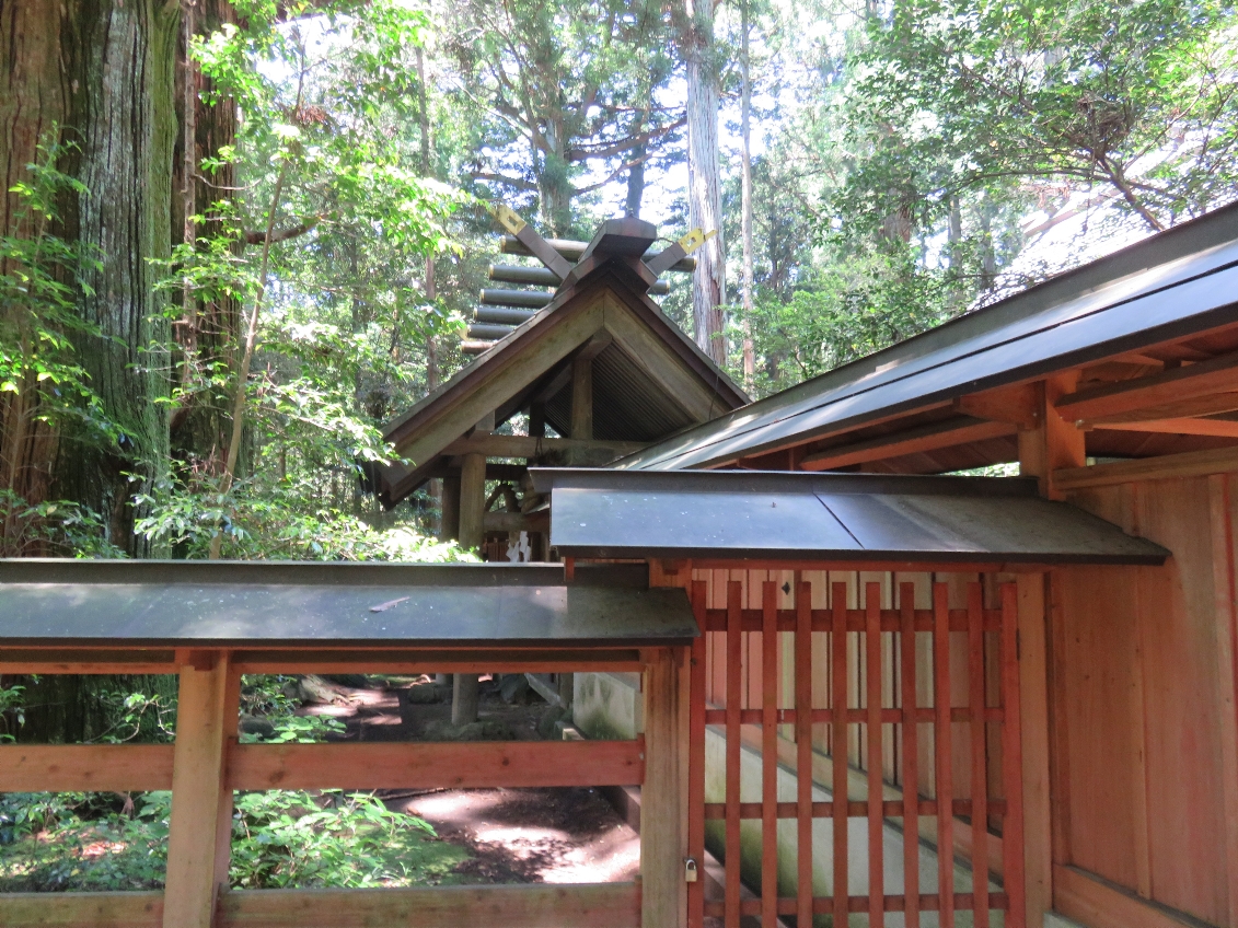 三夜沢赤城神社の拝殿裏のたわら杉と中門(2025/6/17) |