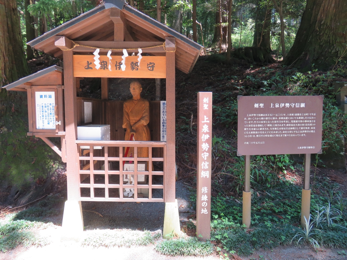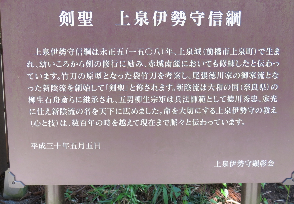 三夜沢赤城神社の剣聖 上泉伊勢守の像と説明版(2025/6/17) |