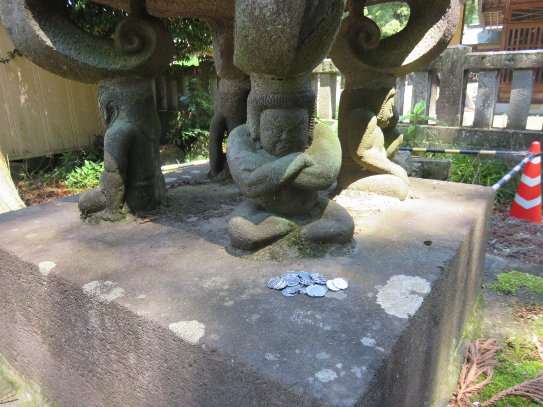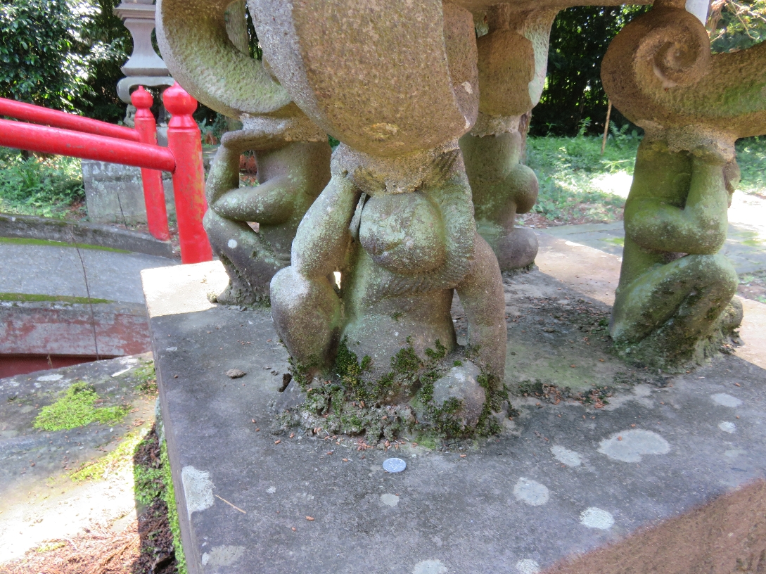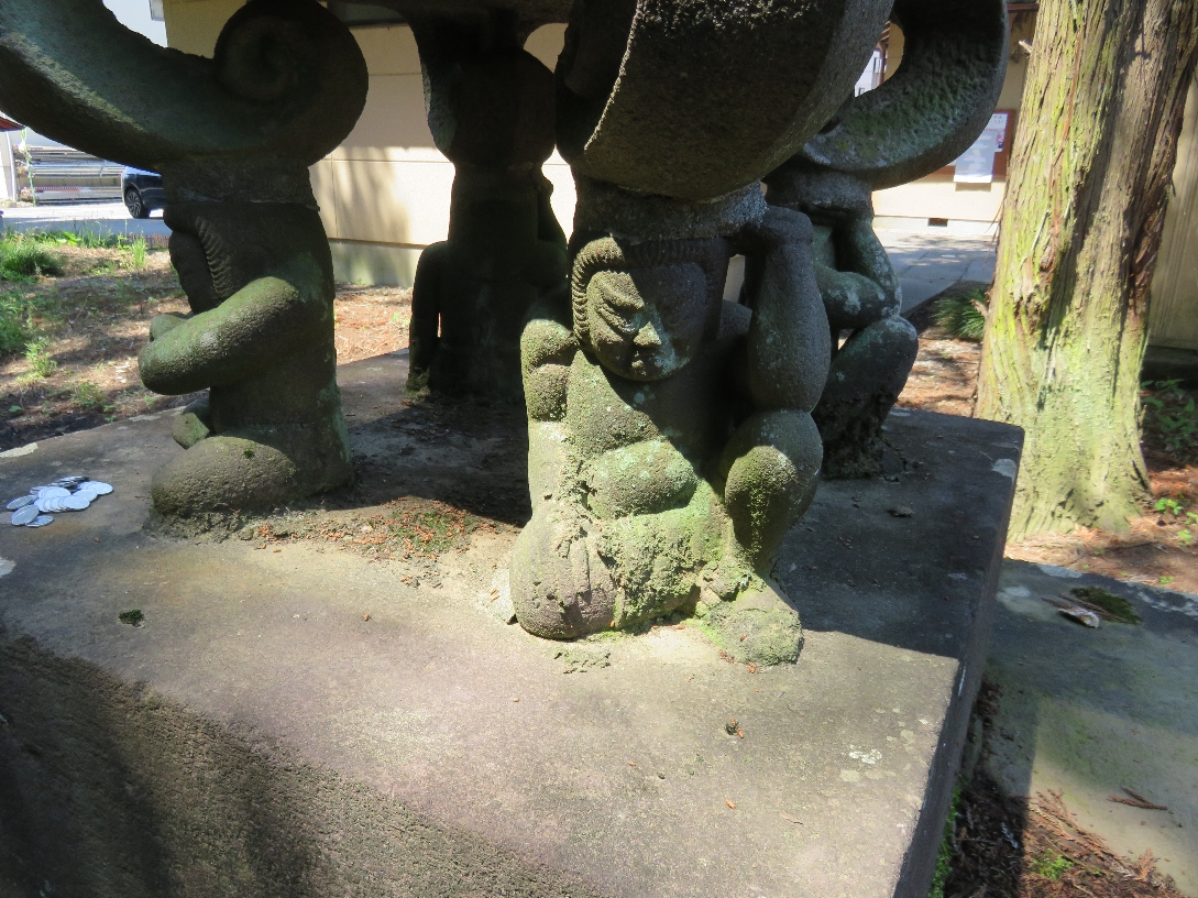 二宮赤城神社の神代橋手前の石灯籠を支えている石像群(2025/6/17) |