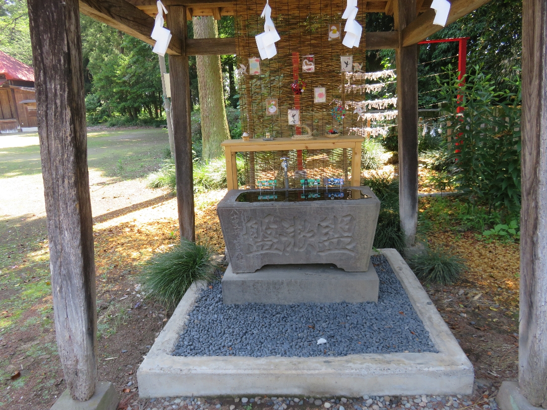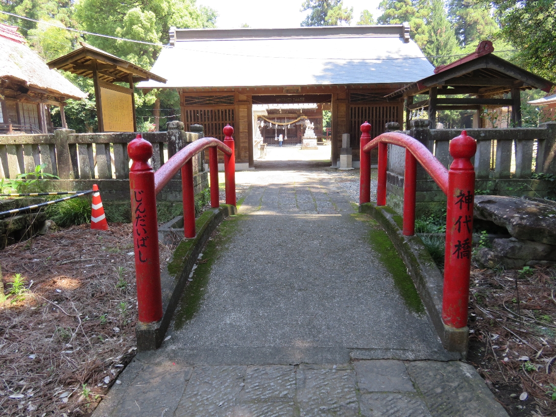二宮赤城神社の神代橋・その右手の手水舎・左手の神社の由緒版・随神門・その奥の拝殿(2025/6/17) |