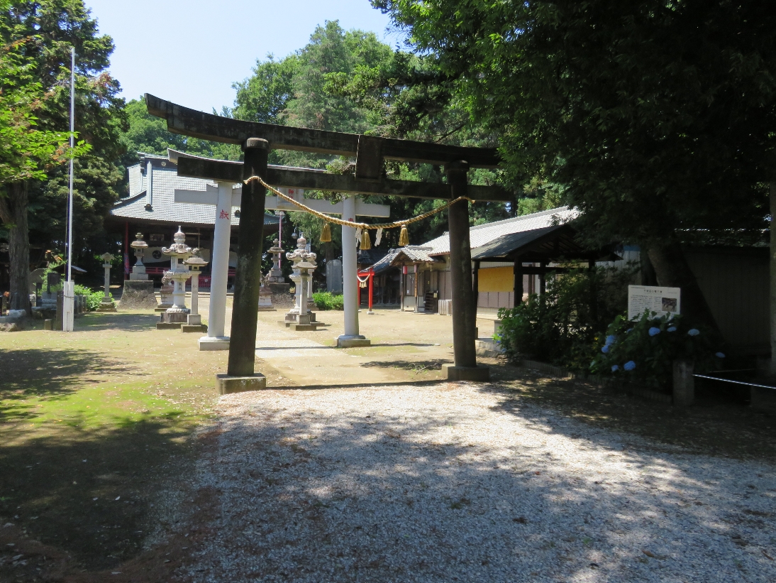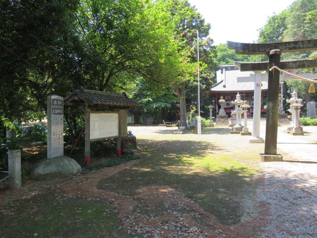 伊勢崎市の大國神社の参道から境内入口にある標柱と境内の鳥居(2025/6/17) |