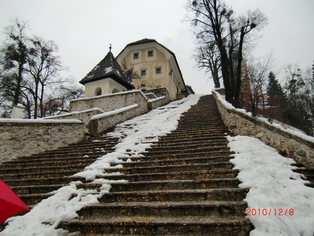 | ブレッド島の船着場からは99段ある階段を登ってバロック様式の聖マリア教会に行く 2010/12/8 |