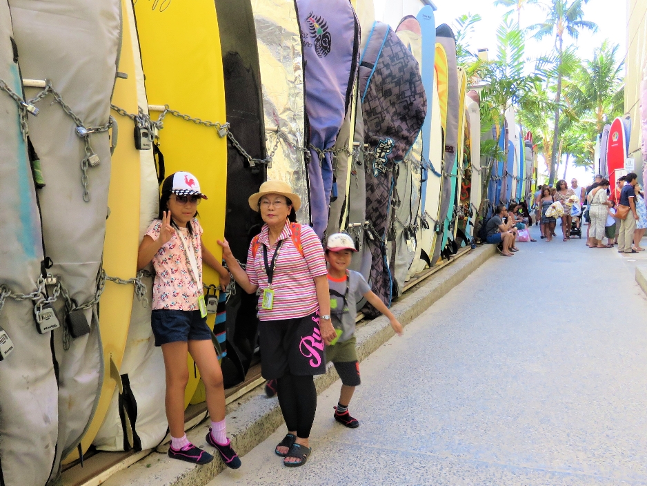 | ワイキキビーチの手前の道端に沢山並んでいるサーフボード 2018/8/21 |