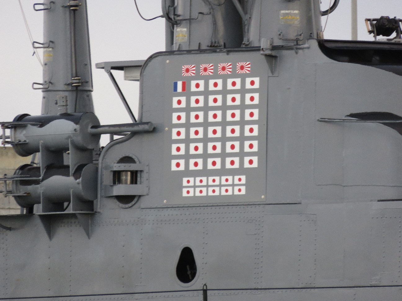 | 潜水艦ボーフィンの戦果(太平洋戦争を通じ日本艦船44隻を撃沈。上の旭日旗4つが軍艦、残り日章旗34は民間船を表している。その中には学童を疎開させていた対馬丸も含まれている。他にヴィシー・フランスの商船1隻を含む) 2019/8/22 |