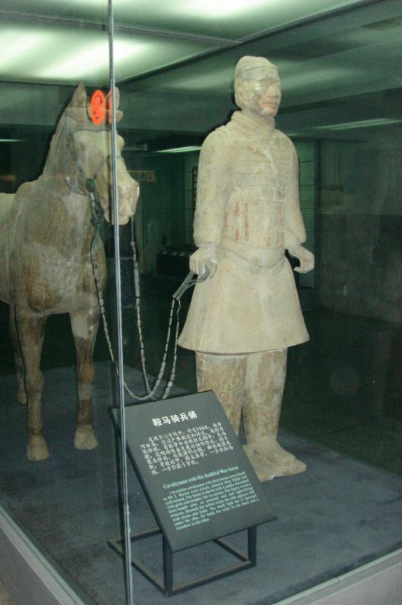 膝まづいて弓をかまえた歩兵の兵馬俑の展示 |