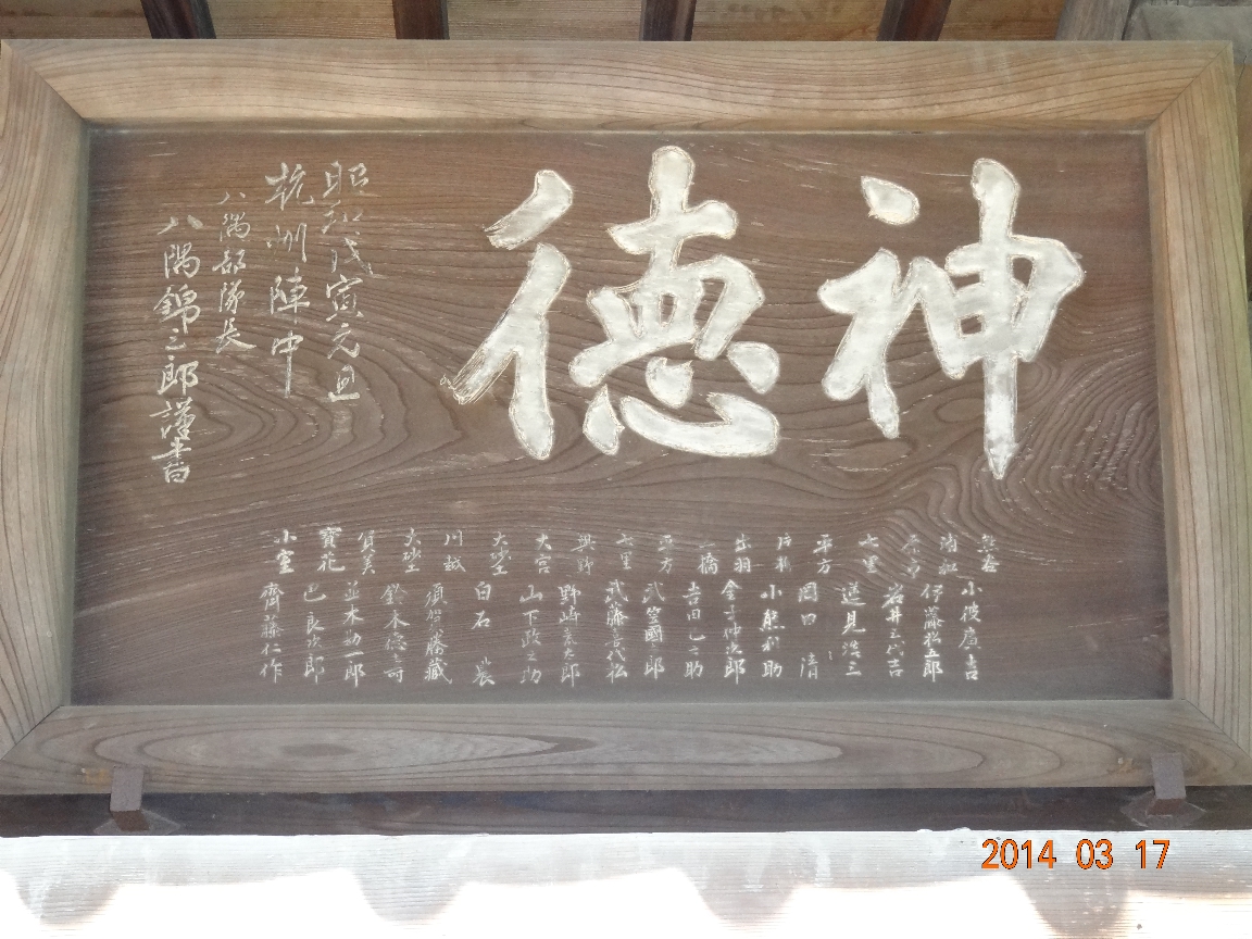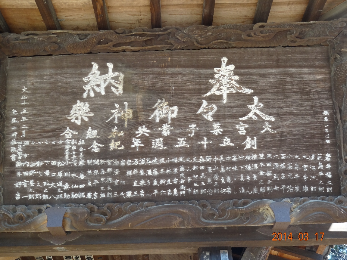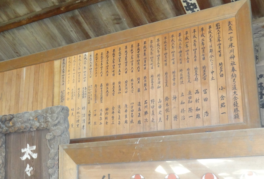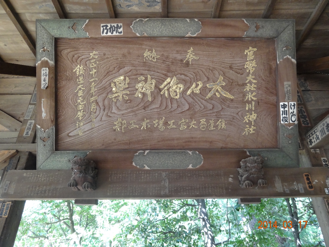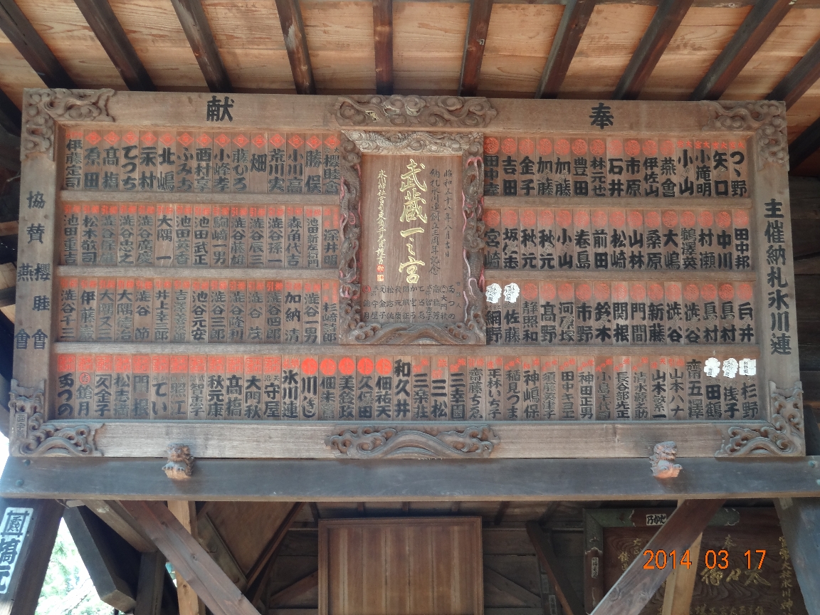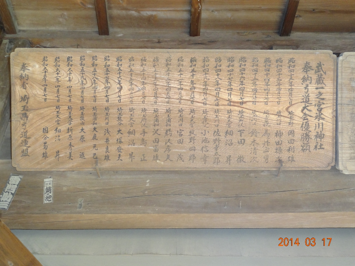 氷川神社の境内の居合術の武蔵一の宮流の奉納額(2014/3/17) |