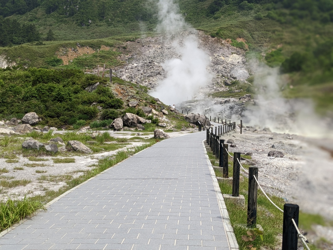 ●玉川温泉の自然研究路・・・十和田八幡平国立公園』に包括される、自然研究路。道の脇には、地熱のある岩場や、玉川温泉の源泉「大噴」があり、大地の息吹を目の当たりにできます。
