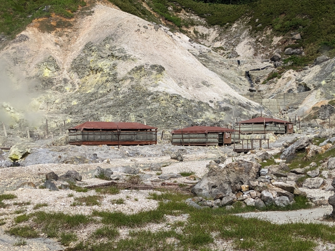 玉川温泉の自然研究路の中の岩盤浴地の利用の建物群(2023/7/7) |