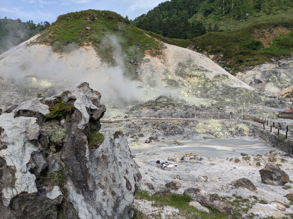 玉川温泉自然研究路脇には地熱のある岩場があります。岩盤から発する地熱を体内に取り入れる温熱浴が「岩盤浴」です。