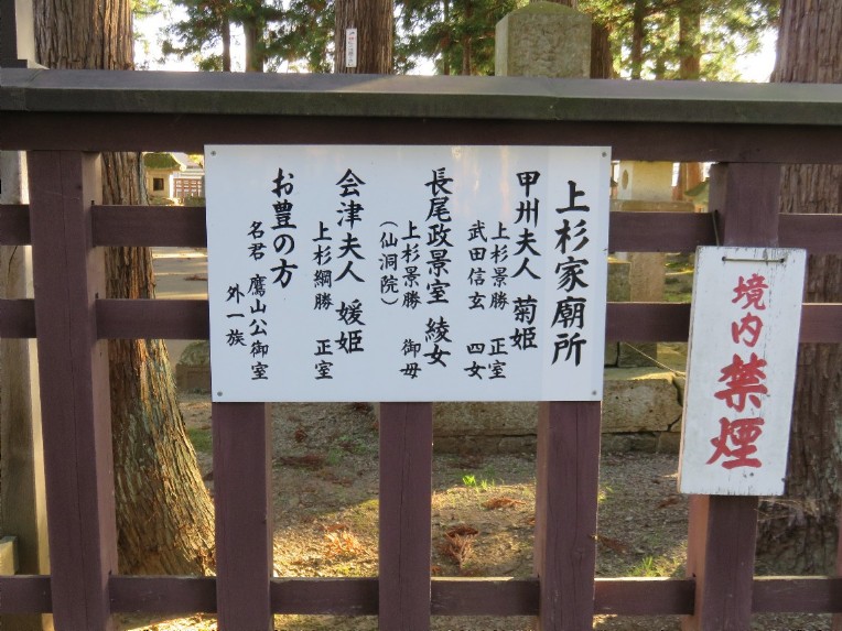 境内の一角には藩主の奥方・子女・支侯家(しこうけ=分家)の廟所があり、景勝正室(武田信玄の娘菊姫)、綱勝正室(保科正之の娘媛姫)、治憲(鷹山)側室お豊の方の墓などが並んでいます(歴代藩主は御廟所)。