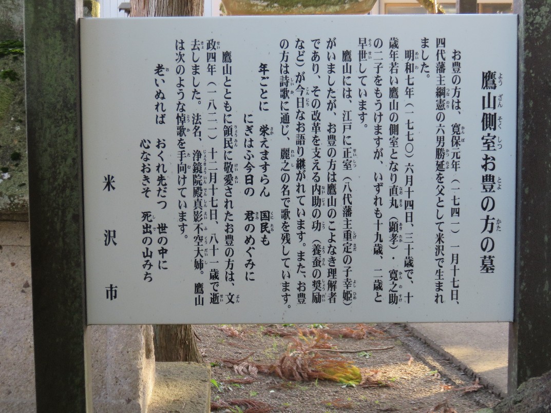 米沢市の春日山林泉寺のお豊の方の墓の説明版(2018/10/25) |
