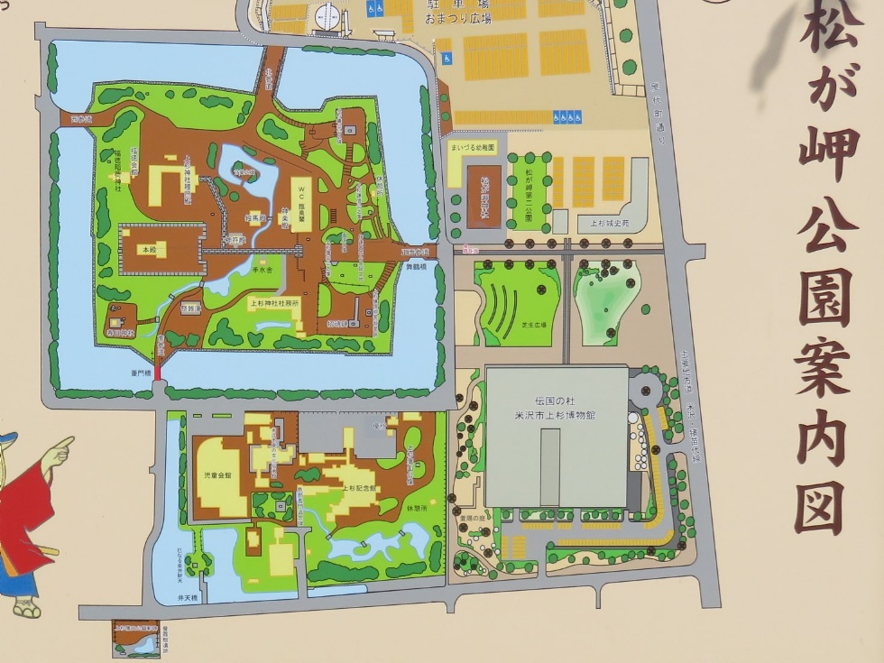 公園のすぐそばには、上杉鷹山などを祀っている「松岬神社」や、ご当地グルメが楽しめて土産品も充実している「米沢城史苑」があります。