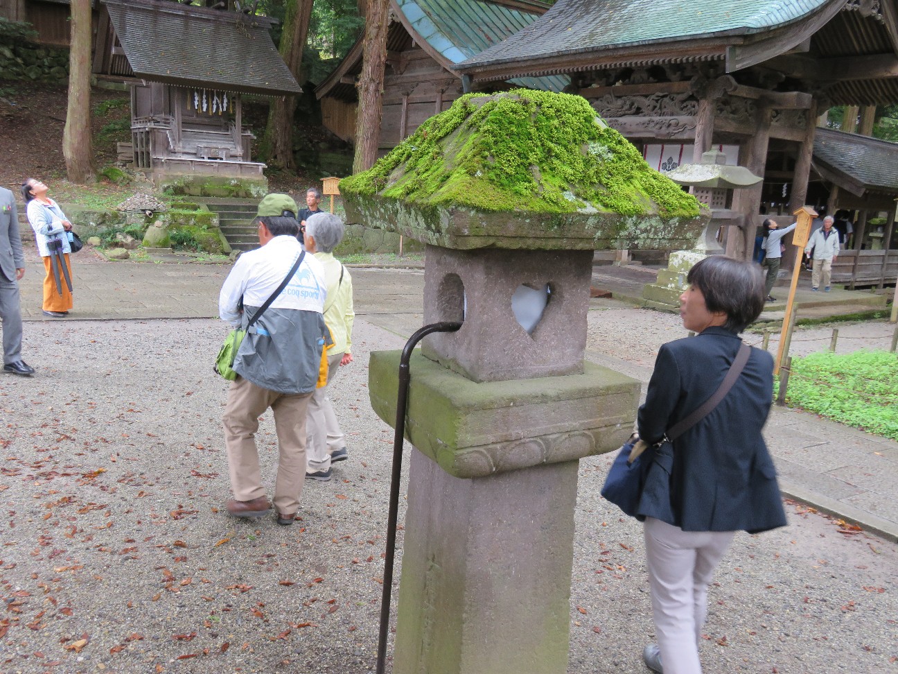 諏訪大社上社本宮のハートの形(魔除けの意味を持つと言われる、猪目型の石灯籠。その形がハートに見える)がある灯篭(2019/10/8) |