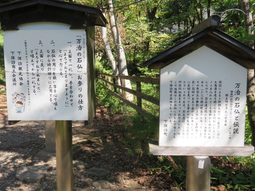 下諏訪町の諏訪市の万治の石仏の説明版とお参りの仕方の説明版(2019/10/9) |