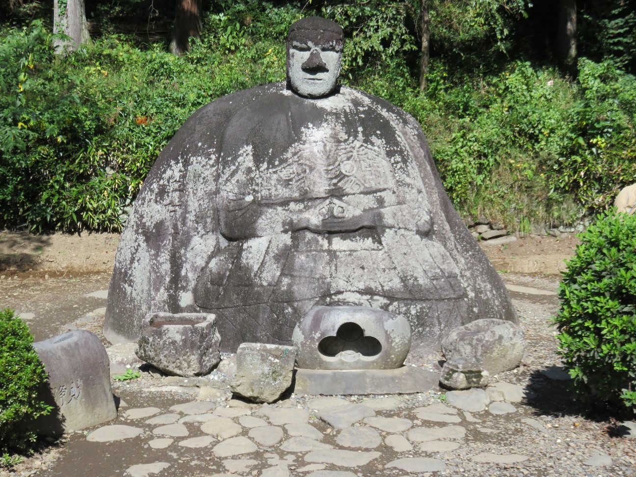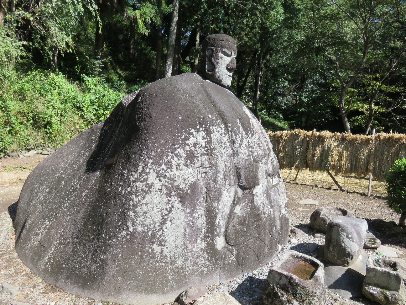 巨大な自然石の胴体に対してアンバランスな頭がちょこんと乗るユーモラスな風貌に加え、胸部に描かれた逆卍(ぎゃくまんじ)や雷、月や太陽などの記号がミステリアスで、