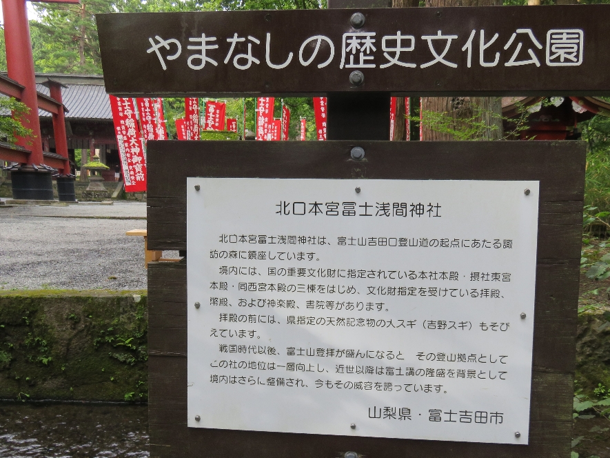 北口本宮冨士浅間神社の随神門前の大鳥居前の北口本宮冨士浅間神社の説明版(2020/9/17) |