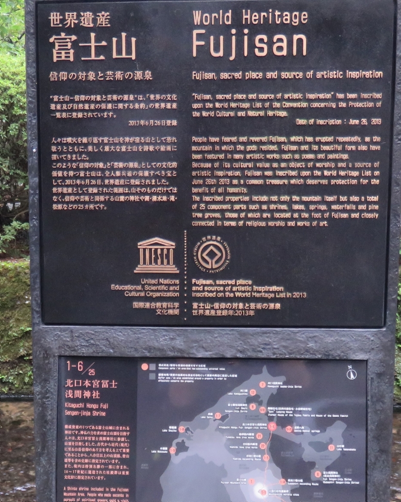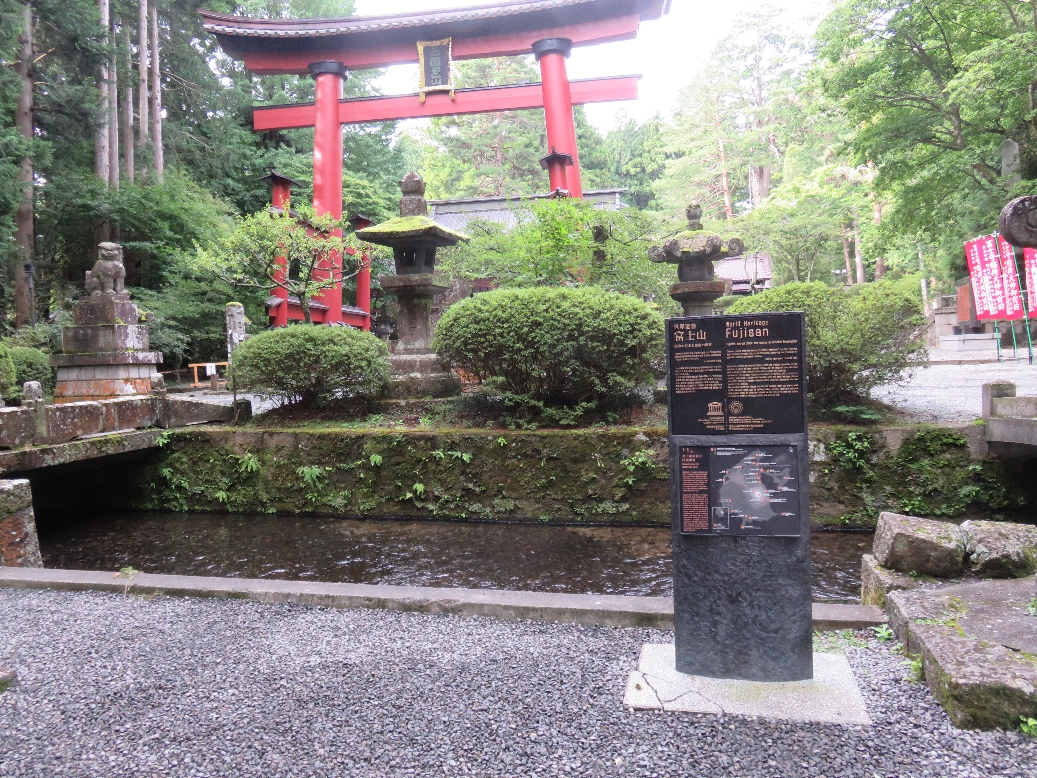 北口本宮冨士浅間神社の随神門前の大鳥居前の富士山と北口本宮冨士浅間神社の説明版(2020/9/17) |