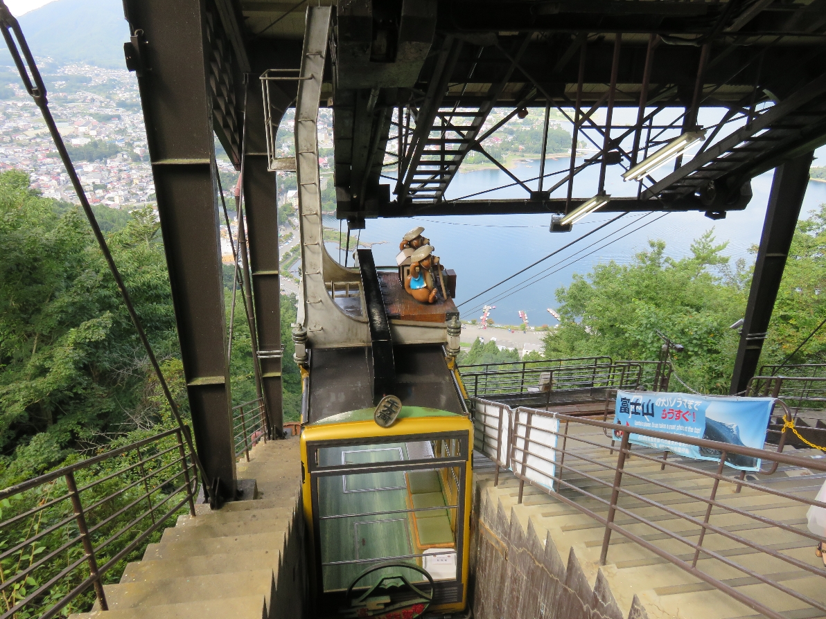 河口湖富士山パノラマロープウェイの天上山の山頂の富士見台駅に到着したロープウェイとその下の河口湖の湖畔(2020/9/19) |