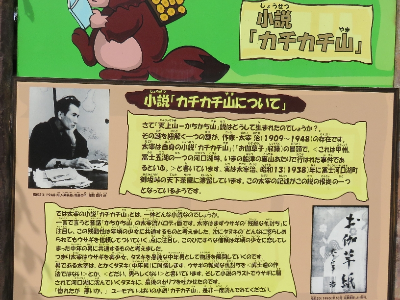 河口湖富士山パノラマロープウェイの天上山の山頂の太宰治の小説「カチカチ山」の説明版(2020/9/19) |