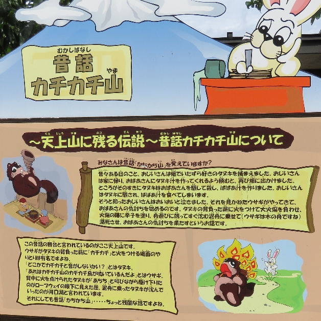 河口湖富士山パノラマロープウェイの天上山の山頂の昔話の「カチカチ山」の説明版(2020/9/19) |