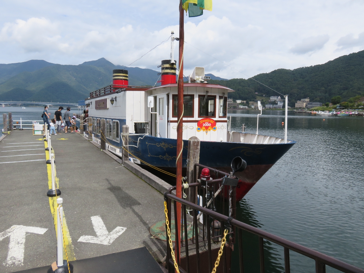 河口湖遊覧船アンソレイユ号も河口湖畔船津浜の乗り場に着きました。(2020/9/19) |