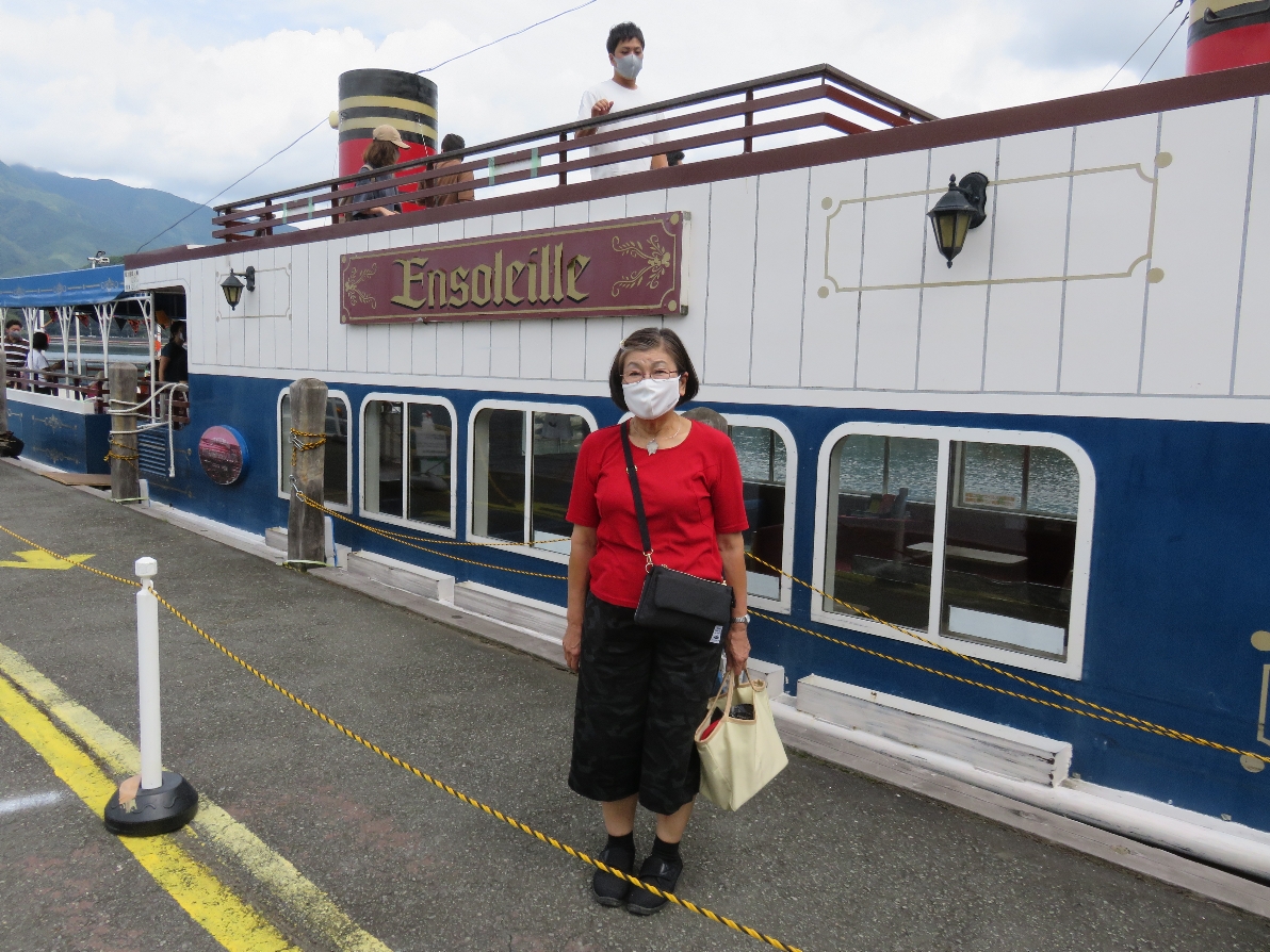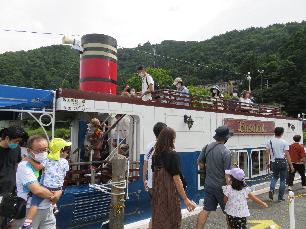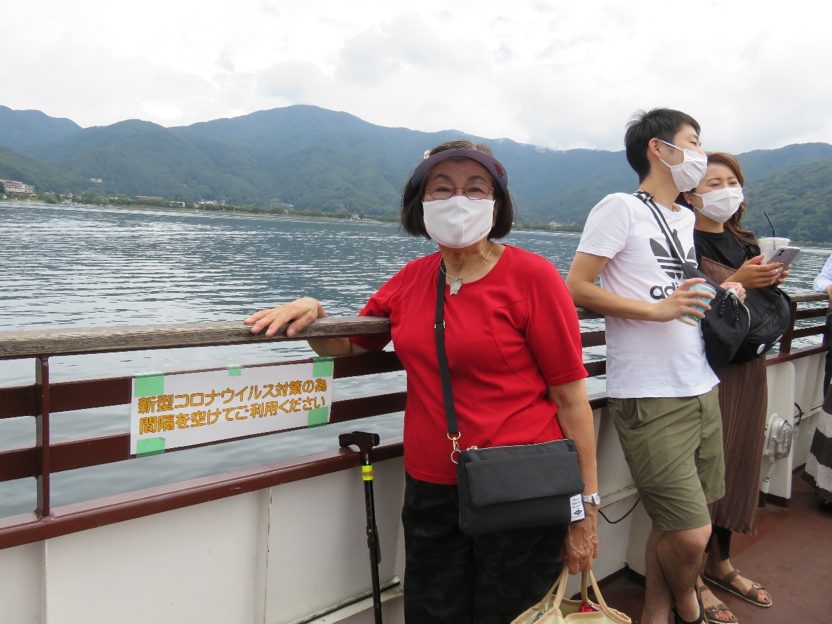河口湖遊覧船アンソレイユ号にコロナウイルス対策でマスクをして乗船(2020/9/19) |
