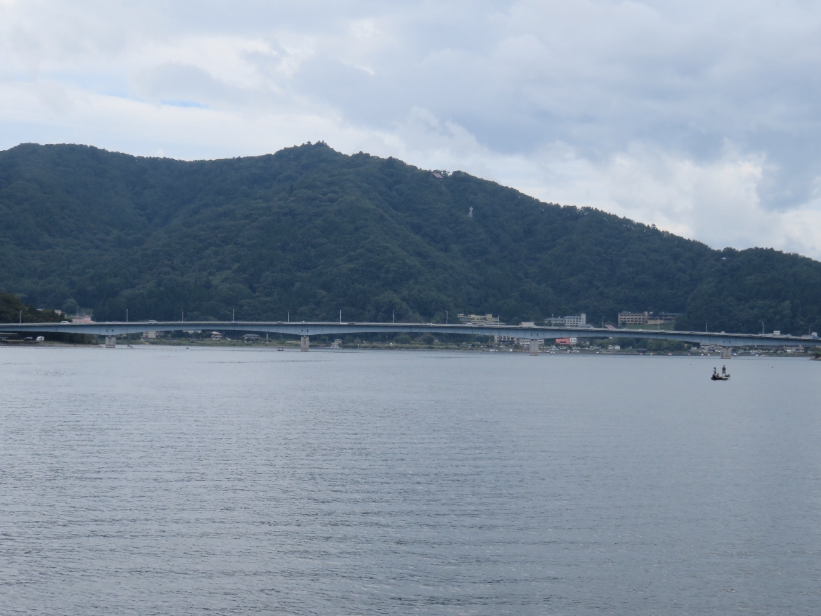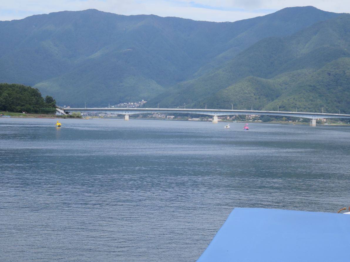 河口湖遊覧船アンソレイユ号からは富士山が曇っていてよく見えない。河口湖大橋はもうすぐ。(2020/9/19) |