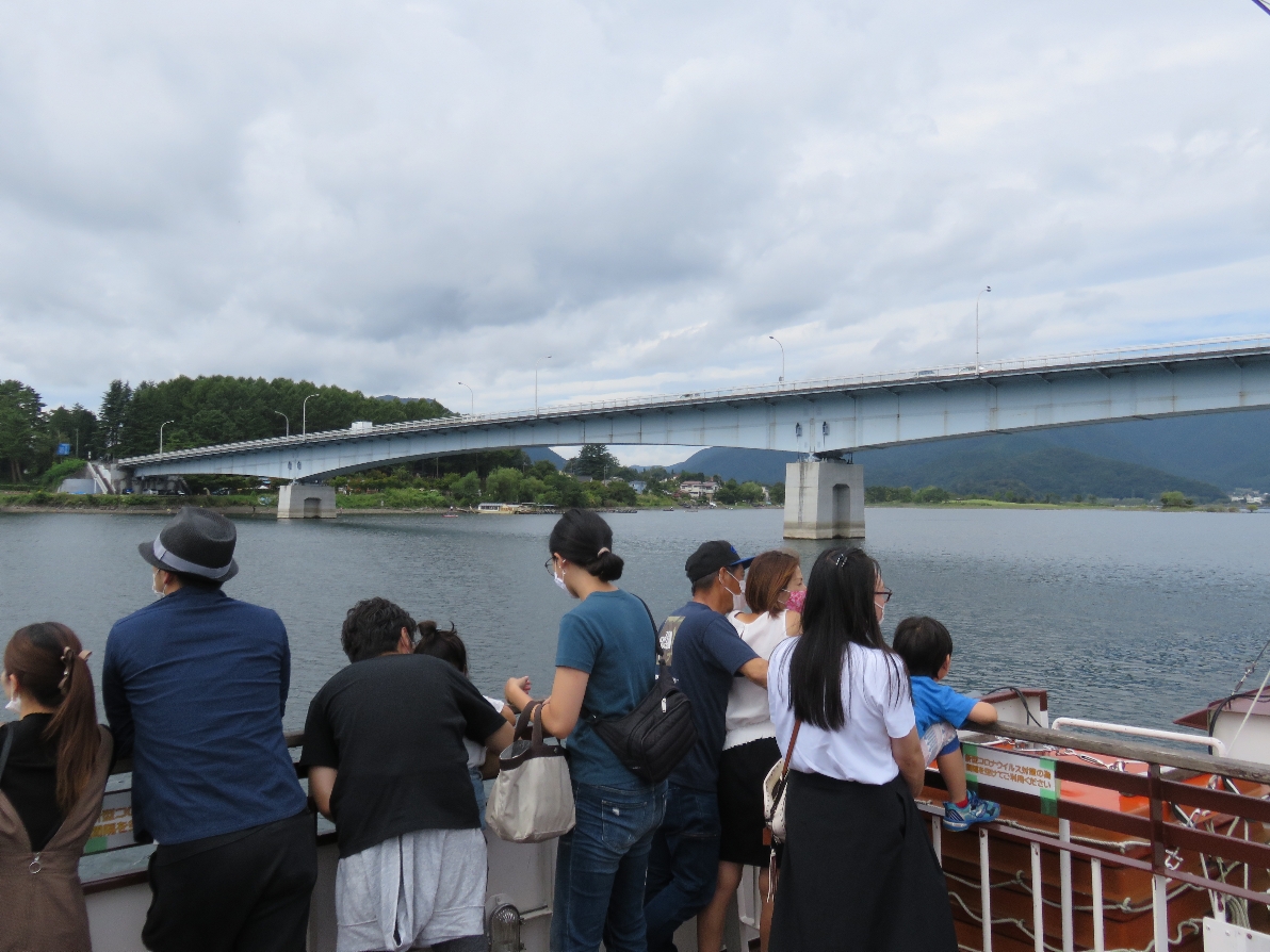 河口湖遊覧船アンソレイユ号からもうすぐ河口湖大橋です。(2020/9/19) |