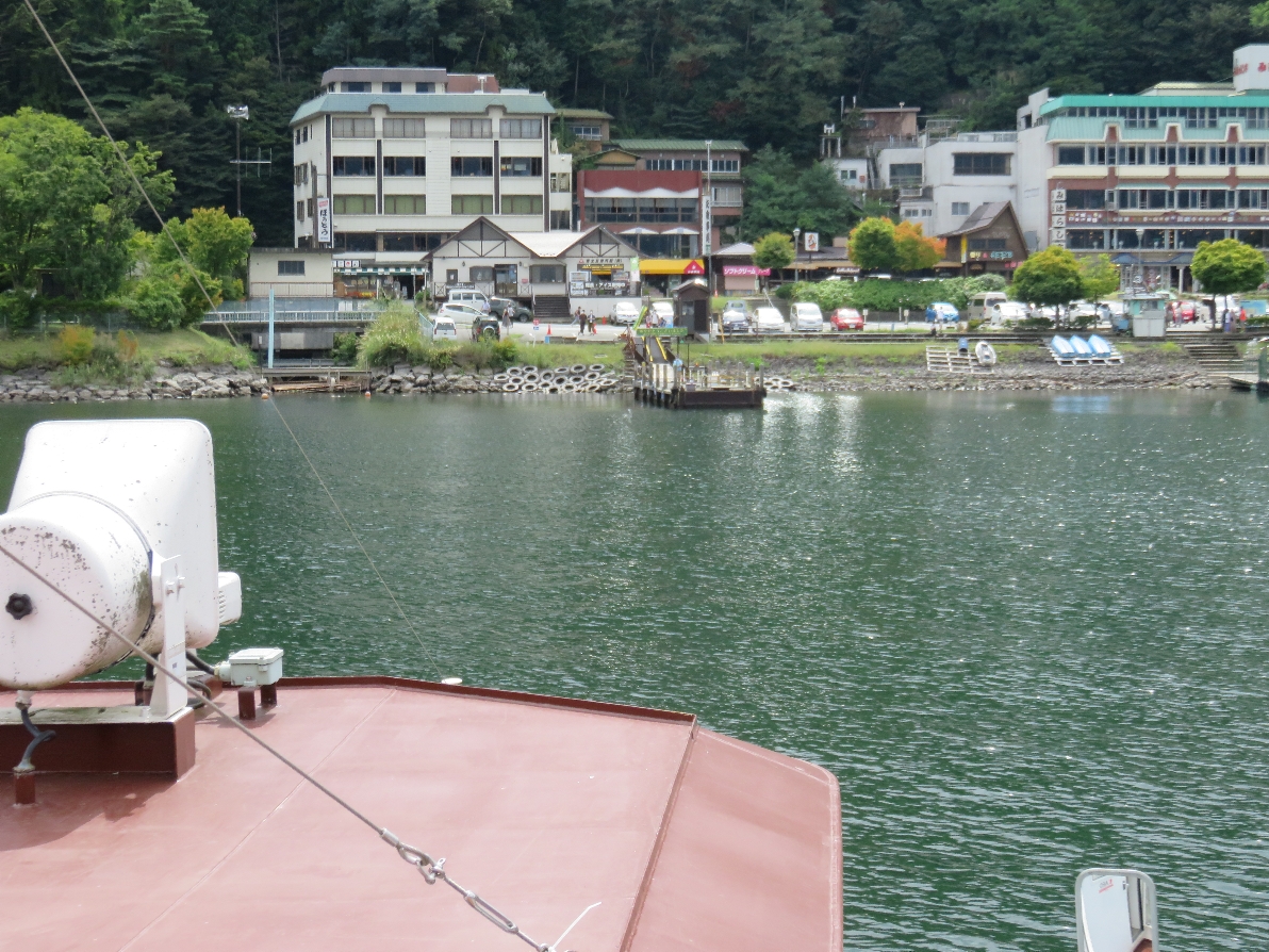 河口湖遊覧船アンソレイユ号の河口湖畔船津浜の乗り場付近(2020/9/19) |