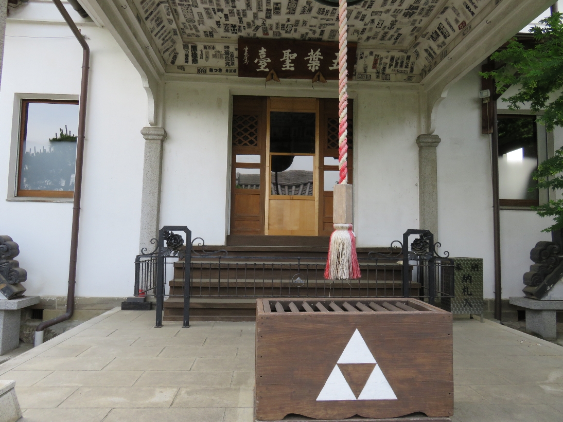 少林寺の本堂・・・本堂は入母屋造り瓦葺で、千鳥破風(ちどりはふ)つきの向拝があり、和風様式で洋風の建築法である。