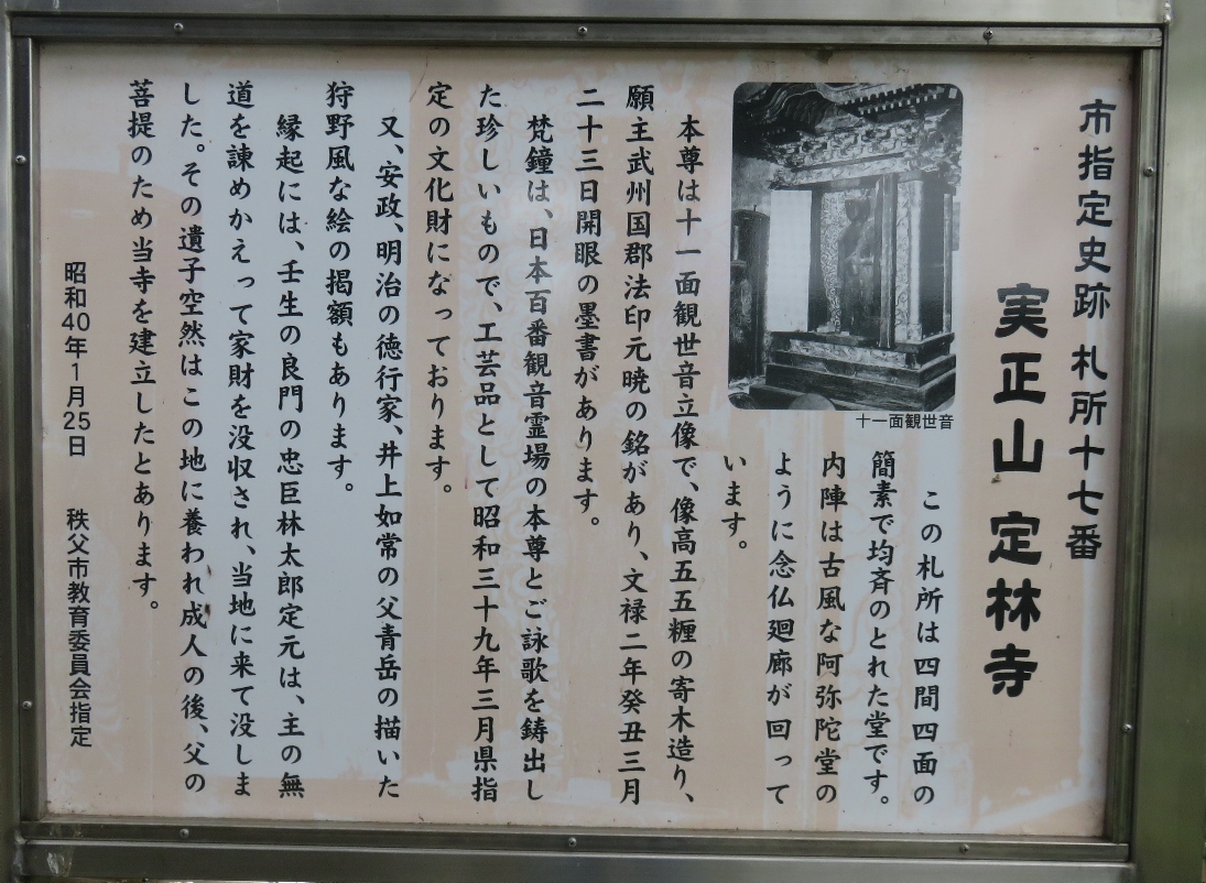 ●実正山定林寺(じっしょうざんじょうりんじ)・・・・・住所 埼玉県秩父市桜木町21-3 秩父札所17番 実正山 定林寺(じっしょうざん じょうりんじ)は、別名“林寺”と言い、もともとは林家の持寺として開創されたと伝えられています。林家は、秩父神社のお触書を村に伝える“触役(ふれやく)”を務めていた家柄で、かつては秩父神社の近くに建立されたお寺でしたが、江戸時代後期に現在の場所に移転しました。