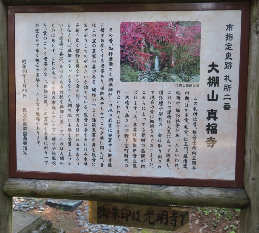 寺は、南面して武甲山と相対しているので、山号を向嶽山と呼んでいる。光明寺は、文保2年(1318年)、鎌倉の建長寺から法性国師をむかえて創建された有名なお寺でした。真福寺は、天文年間(1532年〜1555年)に光明寺の支配下となり、その後、江戸時代に現在の場所に中興されました。(秩父札所連合会のHPより)