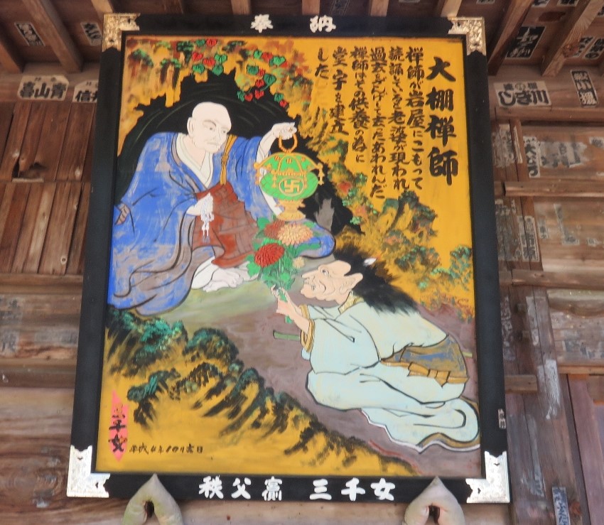 真福寺の観音堂に掲げられている納額・・・観音霊験記の額には下に「秩父宮側 三千女」と書かれている。1988年から25年かけて描き、34札所すべてに秩父市宮側町の「浅賀ちょうちん店」の浅賀三千子さんが奉納した額との事です(2024/6/8) |