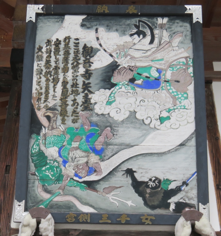 境内に掲額されている「観音霊験記」では、この土地の邪心や悪霊を鎮めるために、八幡の神と武甲山の神が力を合わせ、矢を放って悪霊たちを打ち倒したことから“矢之堂”と呼ばれるようになったという伝説の絵図が記されています。