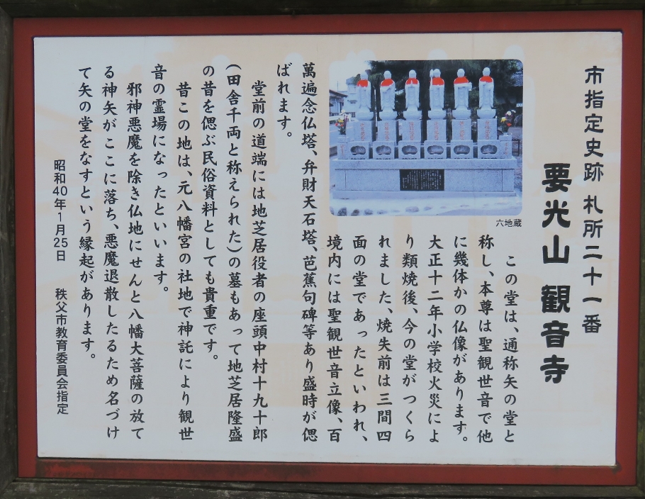 ●要光山観音寺(ようこうざんかんのんじ)・・・・・住所 埼玉県秩父市寺尾2354 聖観世音菩薩がまつられている観音堂は、その昔、“矢之堂(やのどう)”と呼ばれていましたが、これはかつて観音堂が「矢納村」(埼玉県児玉郡)にあったためという説や、平安時代に平将門や矢を納めて戦勝祈願をしたため、という逸話による説もあります。