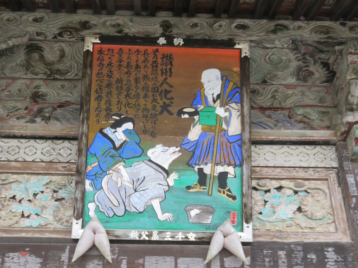 観音堂(童子堂)に掲げられた観音霊験記の額には下に「秩父宮側 三千女」と書かれている。1988年から25年かけて描き、34札所すべてに秩父市宮側町の「浅賀ちょうちん店」の浅賀三千子さんが奉納した額との事です(2023/3/25) |
