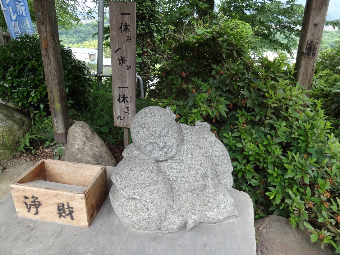 法泉寺の境内の中でも目を引く一休さん像。その隣には、その名の通り一休みできるベンチがあります。眺めの良い景色を見て、少し休みましょう(2024/6/9) |