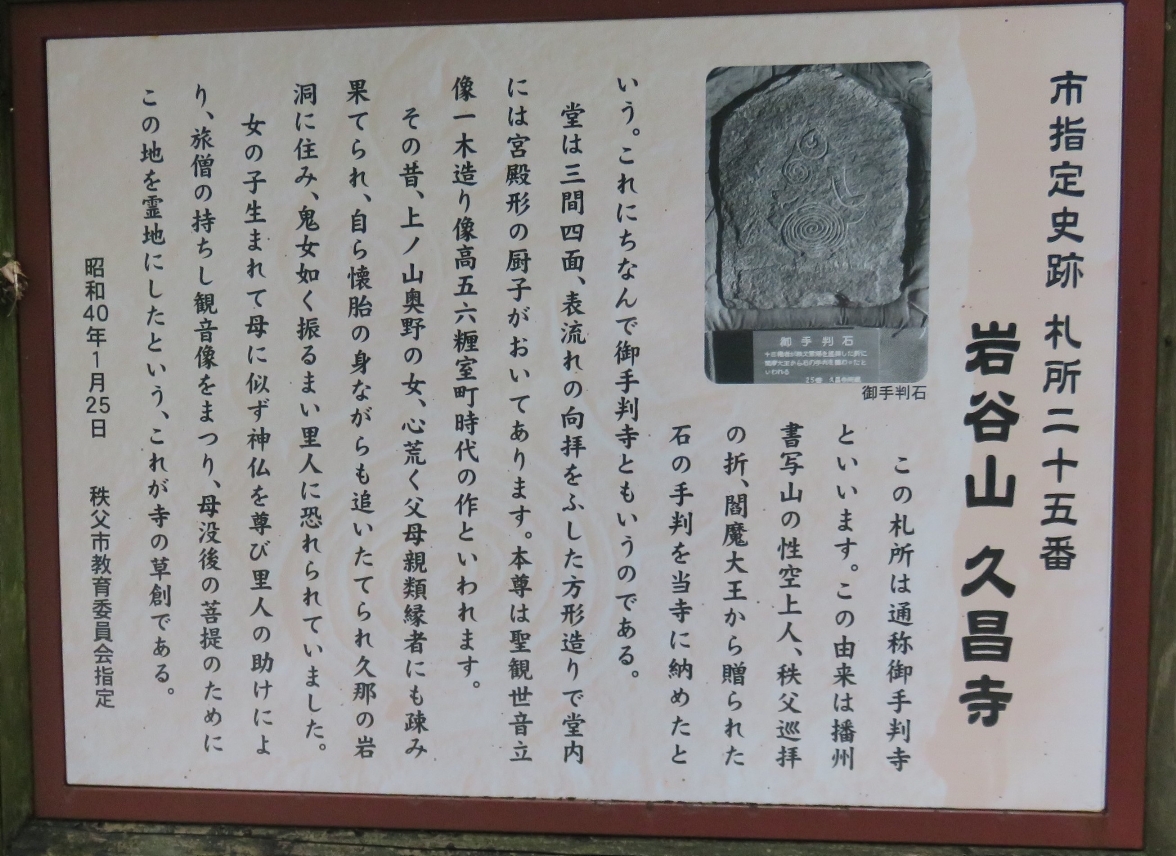 ●岩谷山久昌寺(いわやさんきゅうしょうじ)・・・・・住所 埼玉県秩父市久那2215札所25番 岩谷山 久昌寺(いわやさん きゅうしょうじ)のはじまりは、諸説あります。
