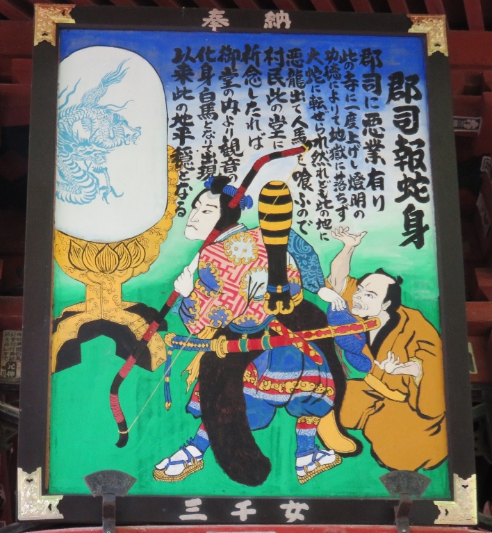 橋立堂の観音堂の納額・・・・・納額には下に「三千女」と書かれている。1988年から25年かけて描き、34札所すべてに秩父市宮側町の「浅賀ちょうちん店」の浅賀三千子さんが奉納した額との事です(2024/7/6) |