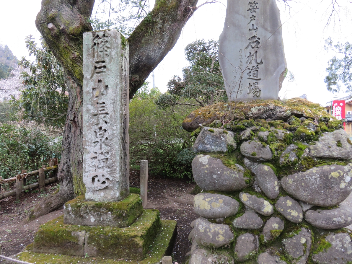 ●参道の入口・・・・・参道の入口の右手には「笹戸山石札道場」と刻まれた石碑が、左手には「笹戸山長泉禅寺」と刻まれた石碑がある。左手の石碑の後ろには「よみがえりの一本桜」と呼ばれるみごとな枝ぶりの枝垂れ桜が根を張っている。(秩父札所連合会のHPより)
