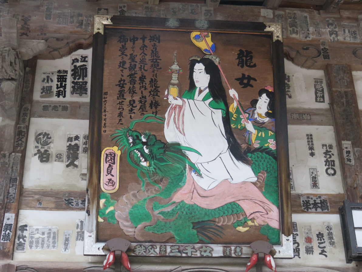 笹戸山長泉院の本堂に掲げられた観音霊験記の額には下に「秩父宮側 三千女」と書かれている。1988年から25年かけて描き、34札所すべてに秩父市宮側町の「浅賀ちょうちん店」の浅賀三千子さんが奉納した額との事です(2016/4/4) |