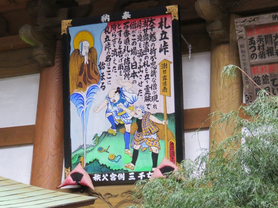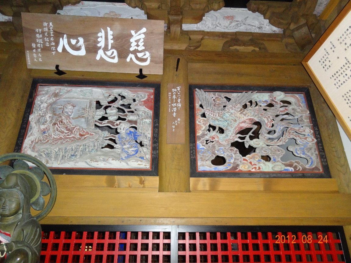 日沢山水潜寺の本堂(観音堂)の外壁に掲げられた観音霊験記の額には下に「秩父宮側 三千女」と書かれている。1988年から25年かけて描き、34札所すべてに秩父市宮側町の「浅賀ちょうちん店」の浅賀三千子さんが奉納した額との事です(2012/8/24) |