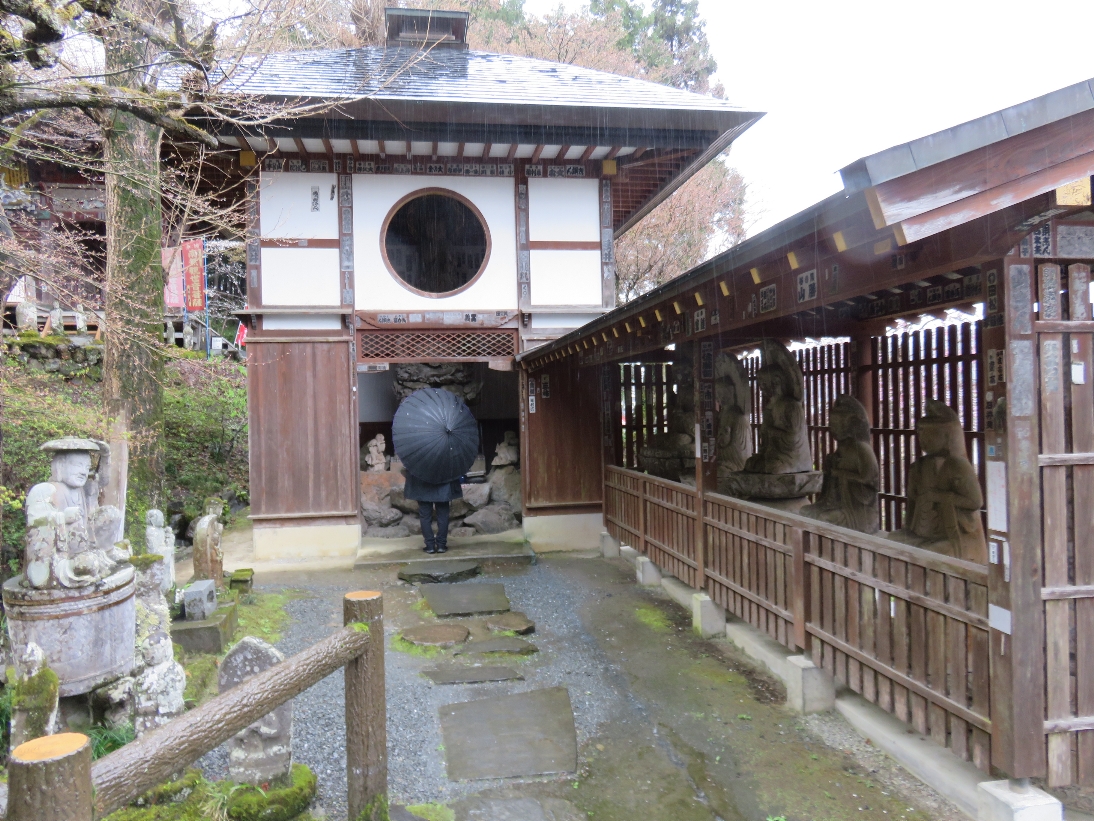 高谷山金昌寺の山門を入った階段の坂道と右側の石仏群(2016/4/5) |