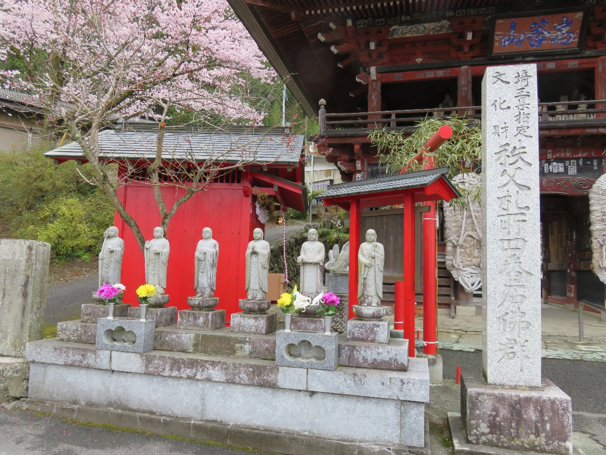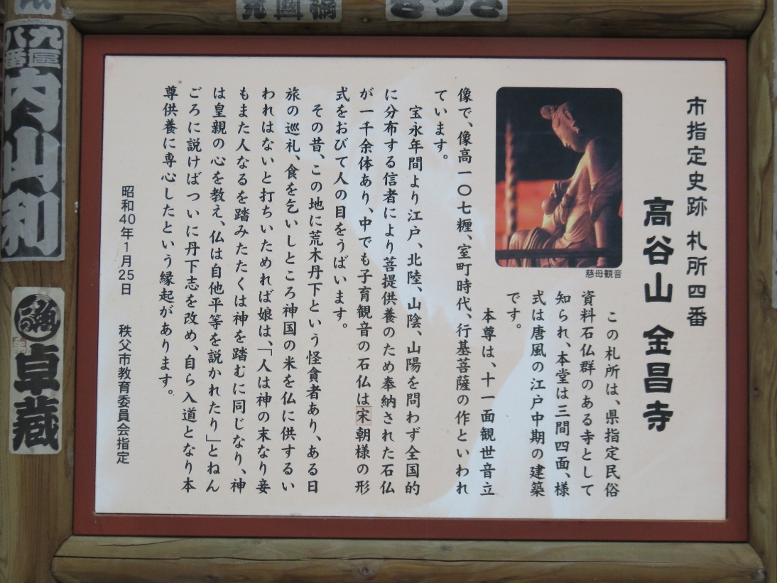 ●高谷山金昌寺(こうこくさん きんしょうじ)・・・・・住所 〒368-0004 埼玉県秩父市山田1803 秩父札所の中でも屈指の仁王門をもち、『石仏の寺』としてもよく知られている。大わらじがかけられた仁王門をくぐれば、そこかしこに石仏が見られ、境内には1300余体の石仏が並ぶ。本堂の回廊右手には、有名な子育て観音像がやさしいまなざしを投げかけている。