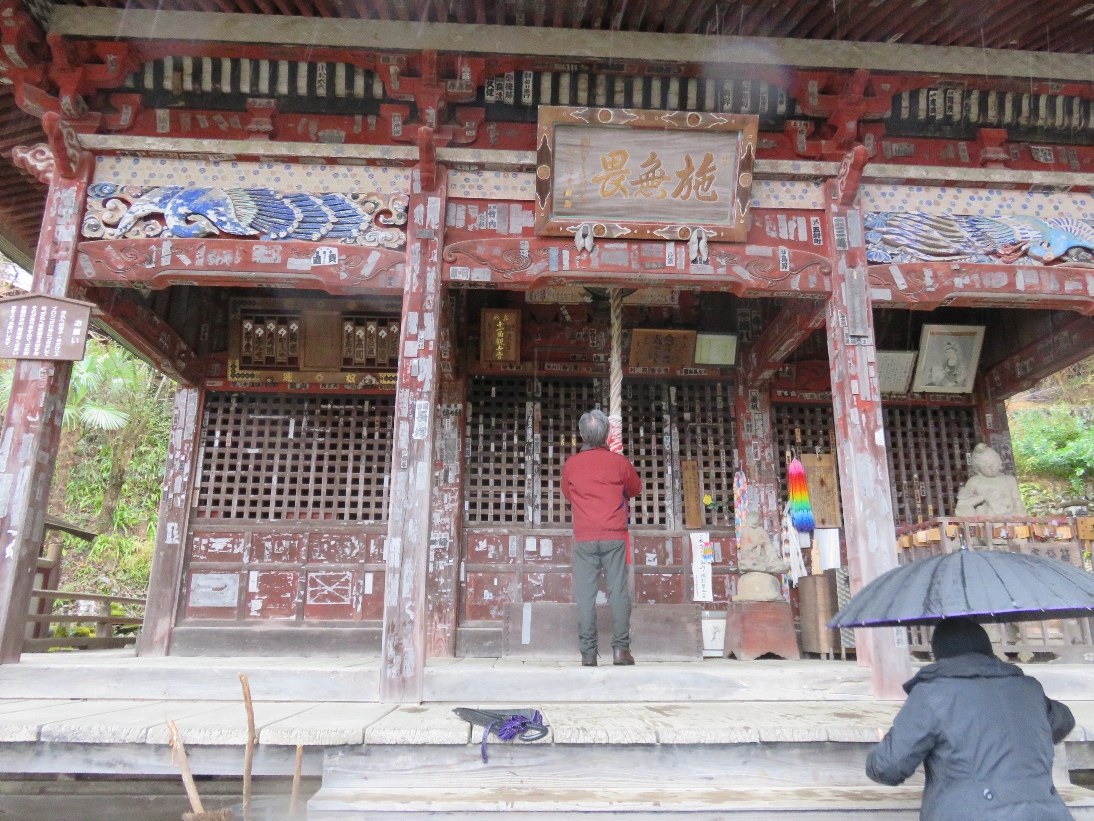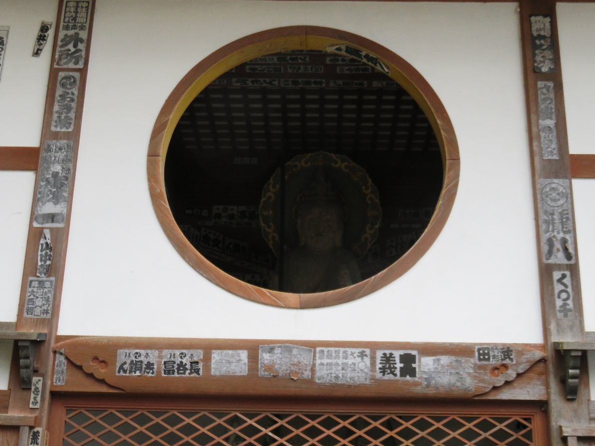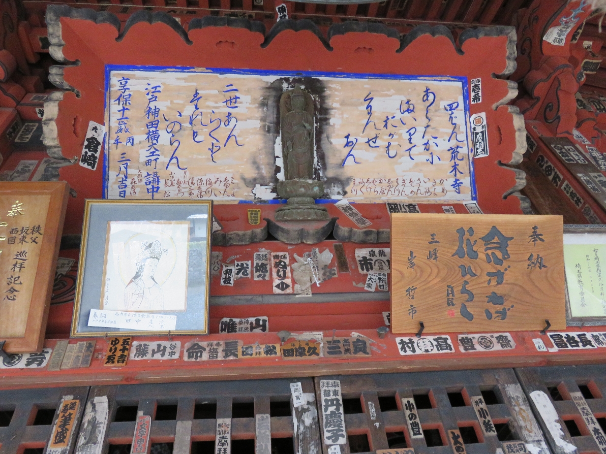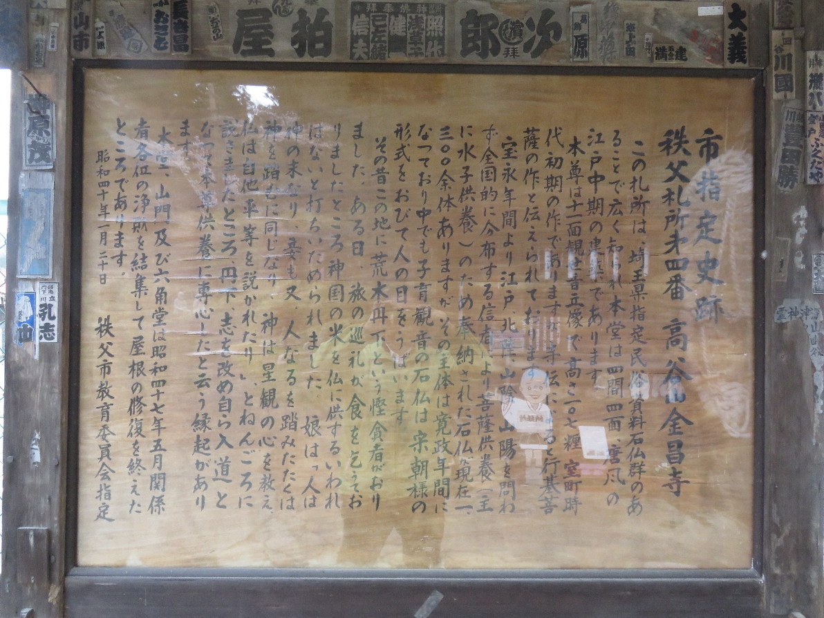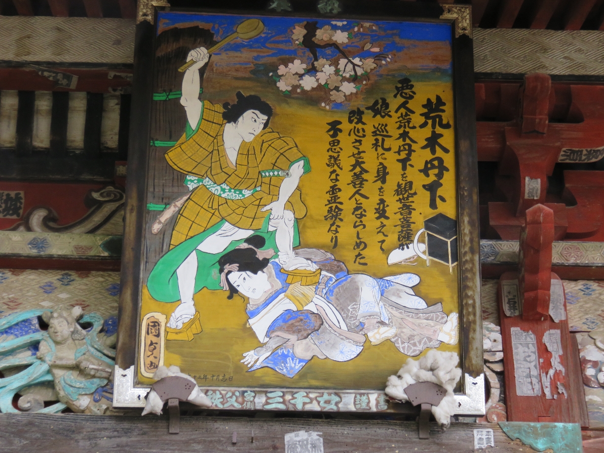 高谷山金昌寺の本堂(観音堂)の荒木丹下の説話の観音霊験記の額には下に「秩父宮側 三千女」と書かれている。1988年から25年かけて描き、34札所すべてに秩父市宮側町の「浅賀ちょうちん店」の浅賀三千子さんが奉納した額との事です(2016/4/5) |