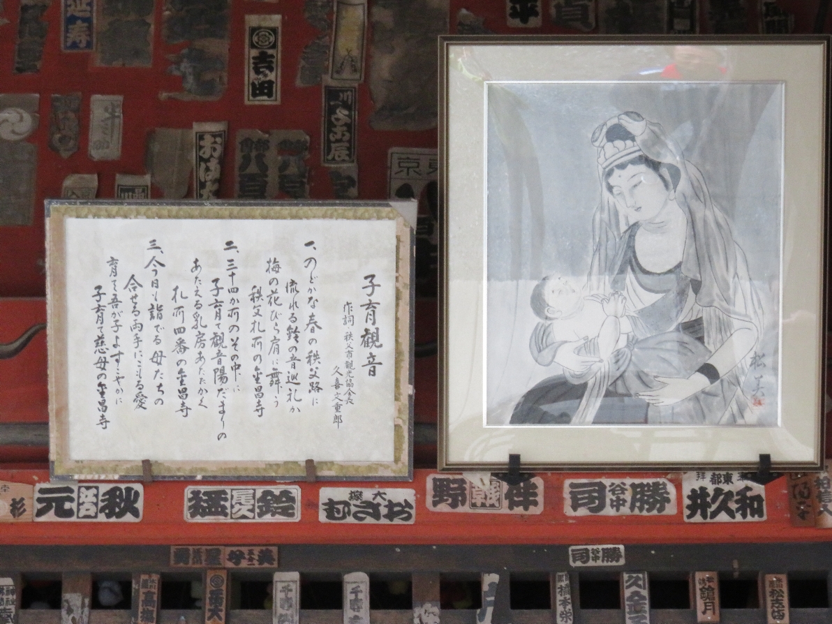 ●子育て観音像・・・・・本堂(観音堂)の回廊右手部分にある、膝に抱く赤子に豊かな乳房をふくませようとする観音様は、ごく当たり前の母子の姿で、満足そうな笑みとやさしいまなざしは見る者の心を和ませる。手の届く場所にあるので、そっと触れる女性も多い。寄進者の吉野屋半左衛門が、金昌寺のご本尊の霊験で子を授かったものの、その後子と妻をあいついで失ったため、生前の母子の姿を浮世絵師に下絵をかかせて建立・供養した仏像である。当時は人前で子にお乳を飲ませるようなことはしなかった。